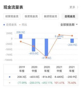 受限制现金为343.46亿元,同比增长108.54%;有息负债为3179.22 亿元、应付账款为2851.22 亿元;总现金流为-200.9亿元。