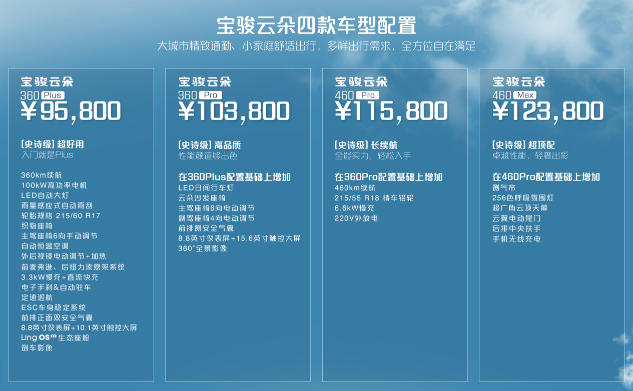 2023年8月10日,“舒适大五座纯电家用车”宝骏云朵全国正式上市。此次宝骏云朵共上市四款配置,360 Plus售价为9.58万、360 Pro售价为10.38万、460 Pro售价为11.58万、460 Max售价为12.38万,正式将中国纯电A级车的价格拉到10万元以内,重新定义了纯电舒适家用车的新选择。除了价格惊喜之外,所有用户还可在8月11日00:00至9月30日24:00期间,参与1000元下订尊享超值四重限时礼遇活动,其中包含充电礼、金融贴息礼、道路救援礼、流量礼。