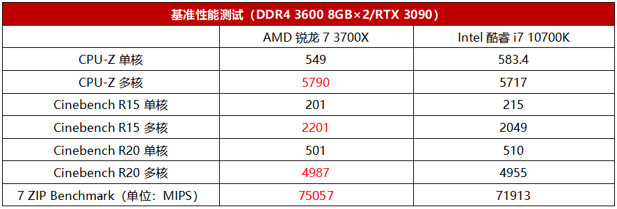 性能上锐龙7 3700X依靠更大的三级缓存获得了更强的多线程性能,在基准测试的多线程项目中都取得了领先。而酷睿i7 10700K在单线程方面依靠高功耗换来的高频率也获得了些许的分数优势,差距非常有限。