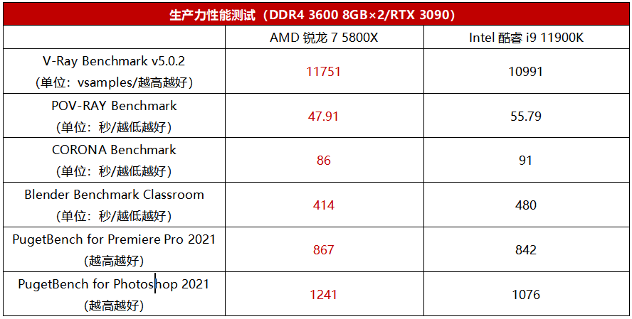 如果你追求的是极致性能,那么就得选择性能最强的8核处理器。目前AMD和Intel两家最强的相关产品分别是锐龙7 5800X和酷睿i9 11900K,虽说两款产品同为8核16线程的规格,但是锐龙7 5800X凭借比对手大了足足一倍的32MB三级缓存,在考验多线程性能的生产力应用当中,执行效率更高。