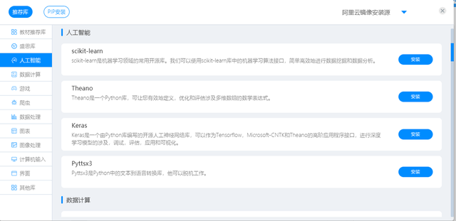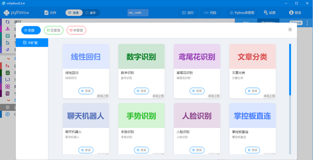 除此之外,mPython还提供了功能库管理,由于使用国内的安装源,安装起来又快又不容易出错,这个也是mPython的优点之一,Python库的管理里面提供了很多功能丰富的库,包括绘图、爬虫、数据处理、人工智能等应用都藏在了其中,如果我们需要调用的话直接可以安装便可以使用了,方便了我们高效的学习。除此之外还有人脸识别,手势识别,数字识别等功能。