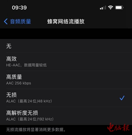 而用户可以分别选择在WiFi和蜂窝网络下,使用哪种试听模式,在系统设置“音乐→偏好设置”中,就可以看到相关选项,比如高效、高质量(AAC)、无损(ALAC)和高解析度无损四个档次,对应音质越来越高。
