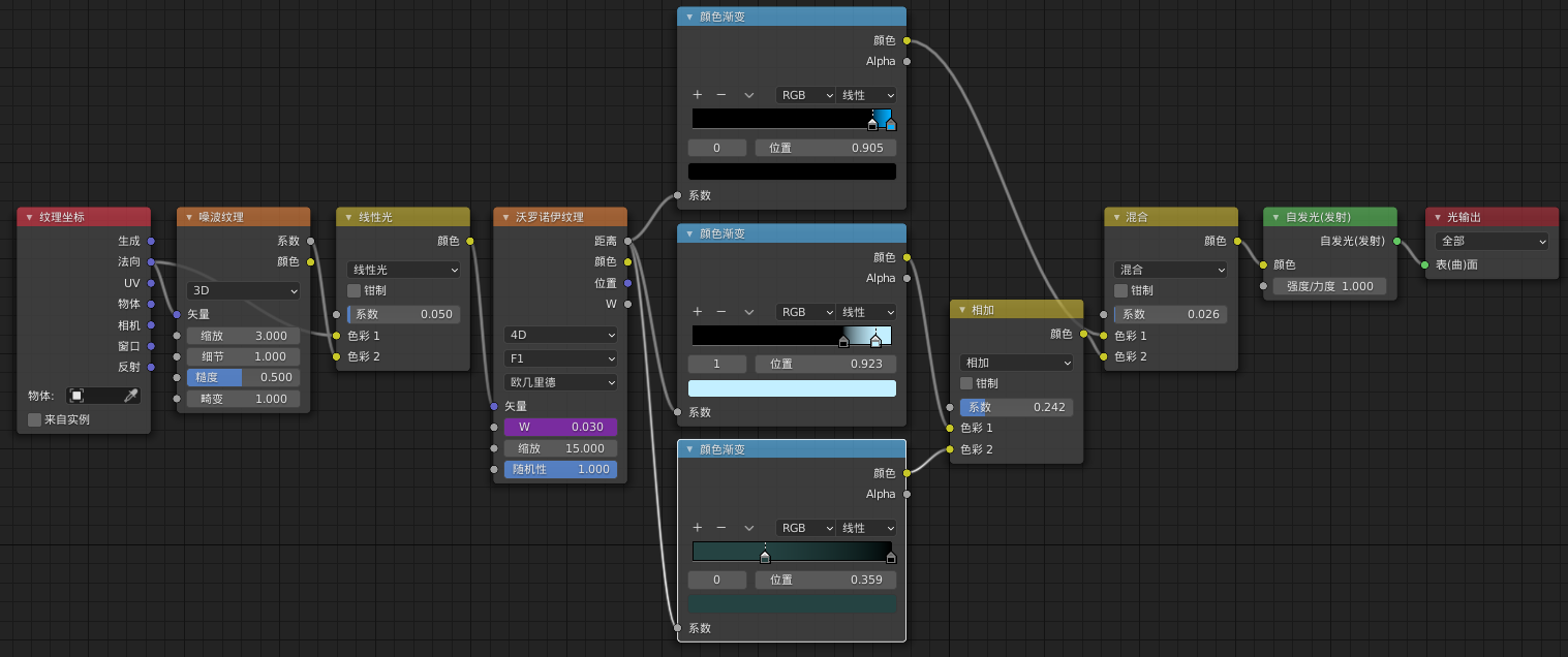 接下来我们需要给沃罗诺伊纹理添加一些不规则的“干扰”,毕竟真实的水下光线就是随机的,而不是一个个的圆。这时候需要在纹理坐标后方再接一个噪波纹理,并将其与原有的法向通过混合RGB的线性光来进行混合,调整混合参数和颜色渐变,就能得到一个相对真实的光线分布。