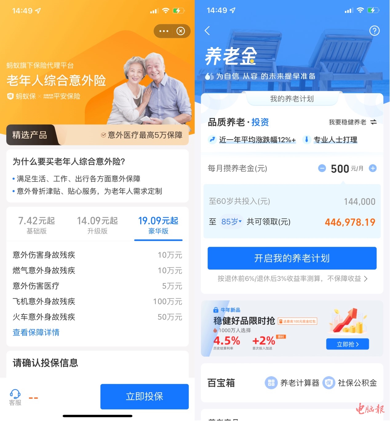 但是,底部仍然保留了理财产品入口,并且除了第一个页面之外,其他子页面都没有进行适老化设计,字号全都恢复正常,界面也没有任何变化。甚至还出现了一些专门针对老年人群的保险、养老理财项目,而且没有明显的风险提示,这显然不符合适老化改造的要求。