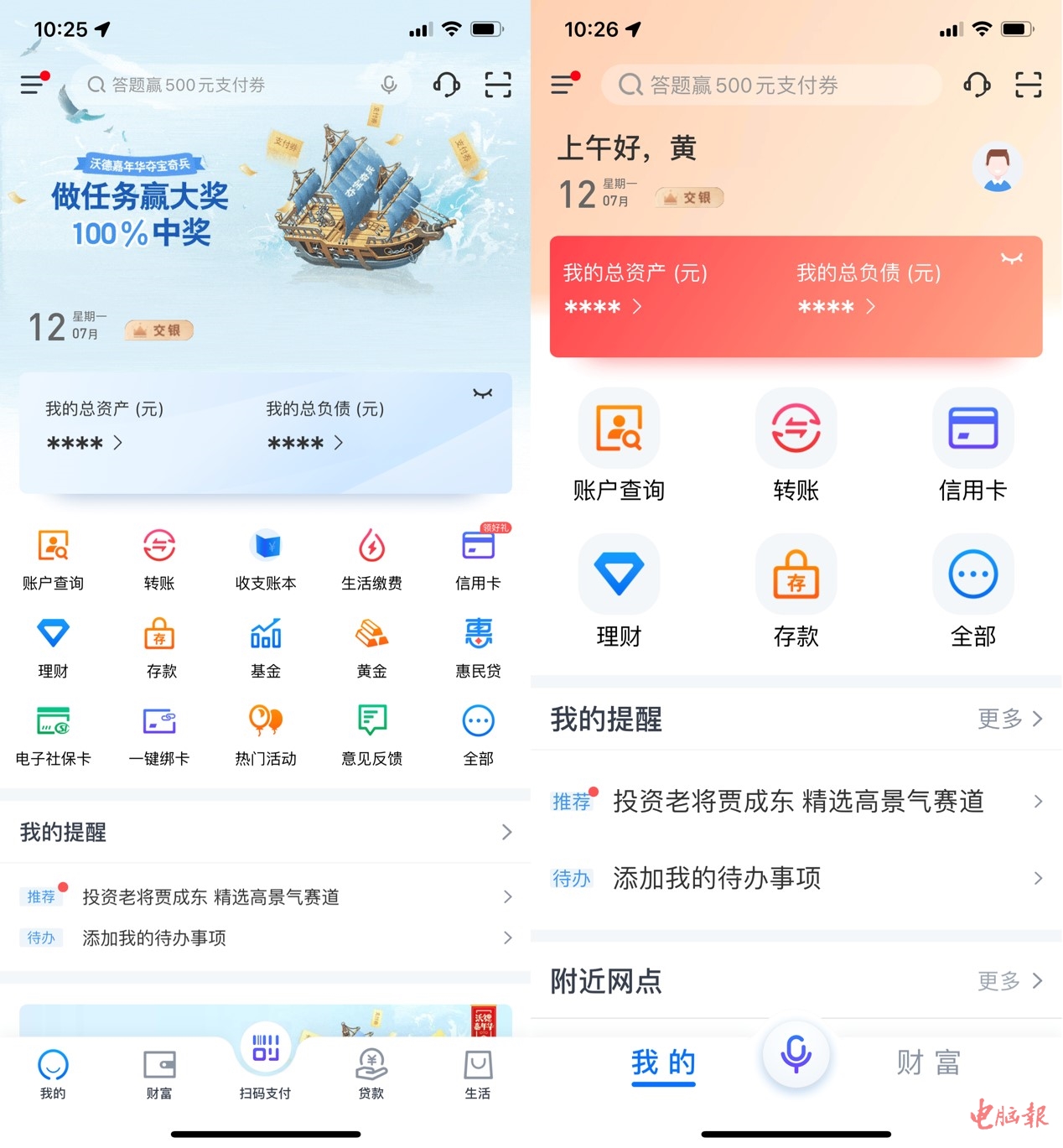 在切换到关爱版后,大字体、大界面不必多说,首页的推荐广告也没有了,只保留了账户查询、转账等常用功能。底部的贷款、生活服务等功能也直接砍掉,如有需求,也可以手动将它们添加到首页。