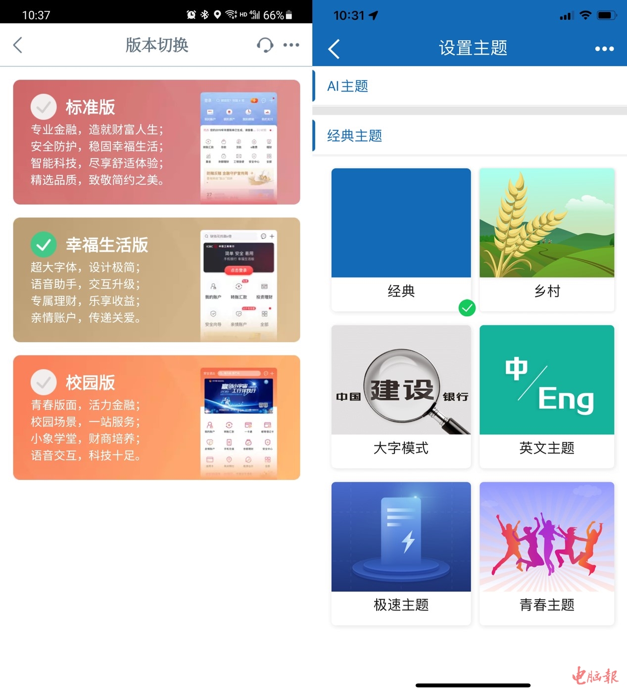 据我的实际测试,发现各大银行的适老化工作都做得很好,几乎都提供了类似的功能入口,比如交通银行的APP,点击左上角菜单键,然后选择“版本切换”就可以看到标准版和关爱版的选项(上图左侧为普通版,右侧为关爱版)。