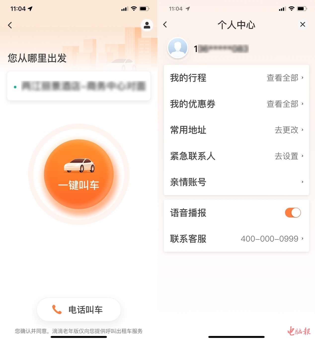 相对来说,在适老化方面做得较好的就是滴滴出行(该软件目前已经下架,已安装的用户可正常使用,本文仅就适老化功能进行讨论)。点击首页的“老人打车”就可以进入专属页面,在这里仅保留了最基本的打车功能,可以设置常用地址然后一键打车,或者通过电话联系客服叫车,也挺方便。