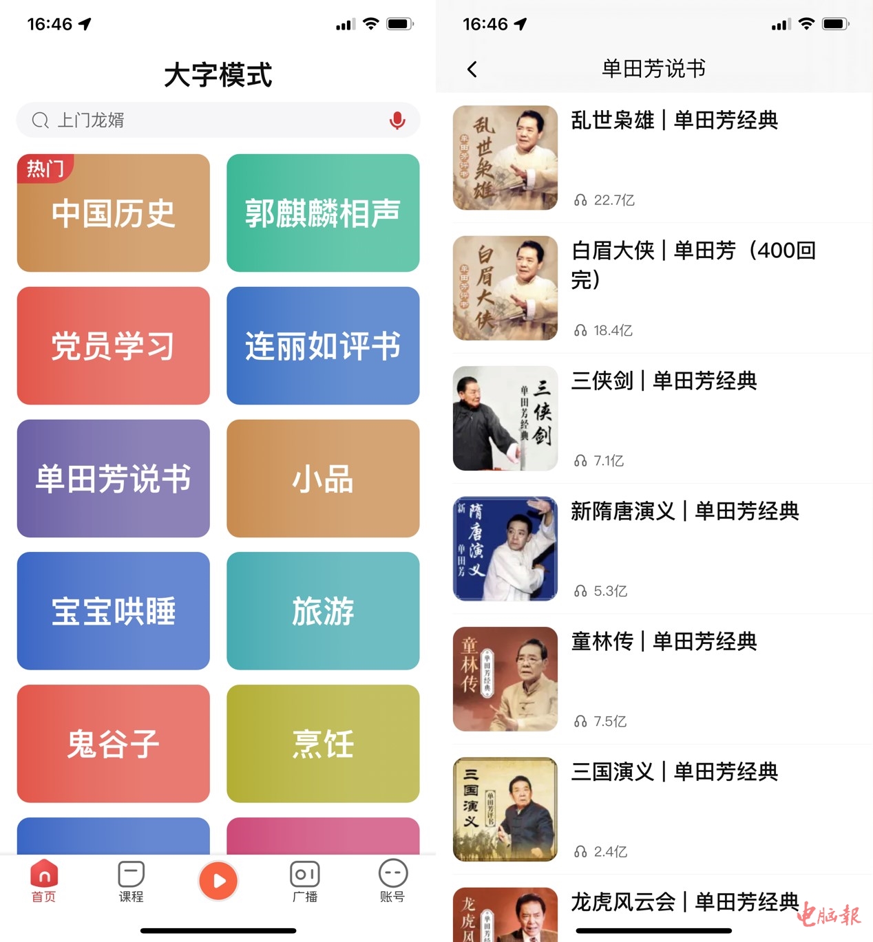 在大字模式中,提供了不少的相声、评书资源,都是中老年用户很喜欢的节目,比如单田芳、刘兰芳等老艺术家的评书就很受欢迎。所以,喜马拉雅的适老化做得也比较完善。