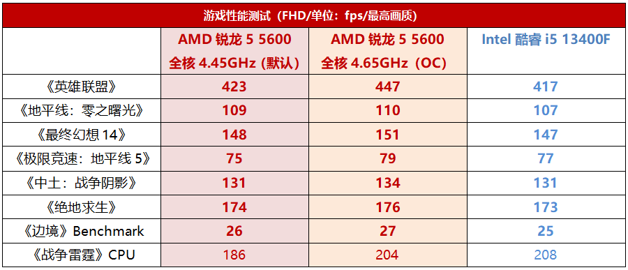 由于锐龙5 5600还支持全面超频,而且很轻松就实现了全核4.65GHz的频率,此时游戏帧率进一步提升,尤其是《英雄联盟》中相对酷睿i5 13400F的优势已经达到了7%,同时领先的游戏数量也达到了7款,已经是胜券在握。