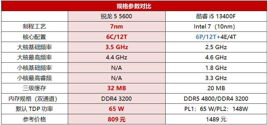 锐龙5 5600采用7nm Zen3架构,即便并不是锐龙7000所用的5nm工艺,但也领先了酷睿i5 13400F的Intel 7(10nm)工艺,因此在能效比方面依旧很有优势,散热方面更是用盒装赠送的幽灵散热器即可搞定。频率方面,锐龙5 5600最高加速频率为4.4GHz,酷睿i5 13400F的大核最高睿频为4.6GHz。看起来酷睿i5 13400F似乎更有优势,但实际上由于目前的游戏对多线程的支持都很到位了,处理器很多时候都跑在全核加速频率上,而锐龙5 5600在一线B550主板上默认都是全核4.4GHz(部分主板甚至可以到4.45GHz),超过酷睿i5 13400F的全核4.1GHz不少,所以这方面实际上是领先的。此外,锐龙5 5600的三级缓存也高达32MB,明显超过酷睿i5 13400F的20MB,所以在游戏应用方面,锐龙5 5600的规格并不落伍,甚至能在IPC方面扳回一些局面。