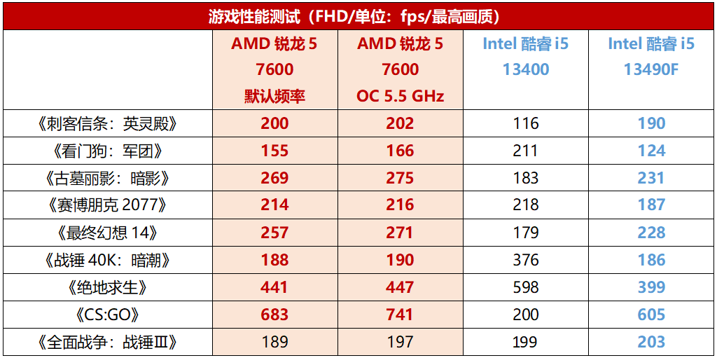 当然这还不是锐龙5 7600的全部实力,要知道这款处理器还能超频,全核5.5GHz都是小菜一碟。在此高频率下,锐龙5 7600的游戏性能还能进一步提升。超频之后几款游戏平均下来更是领先酷睿i5 13400大约18.3%,在《看门狗:军团》中领先幅度甚至高达43.1%;平均帧率更是领先酷睿i5 13490F大约14%,这算是非常大的优势了。