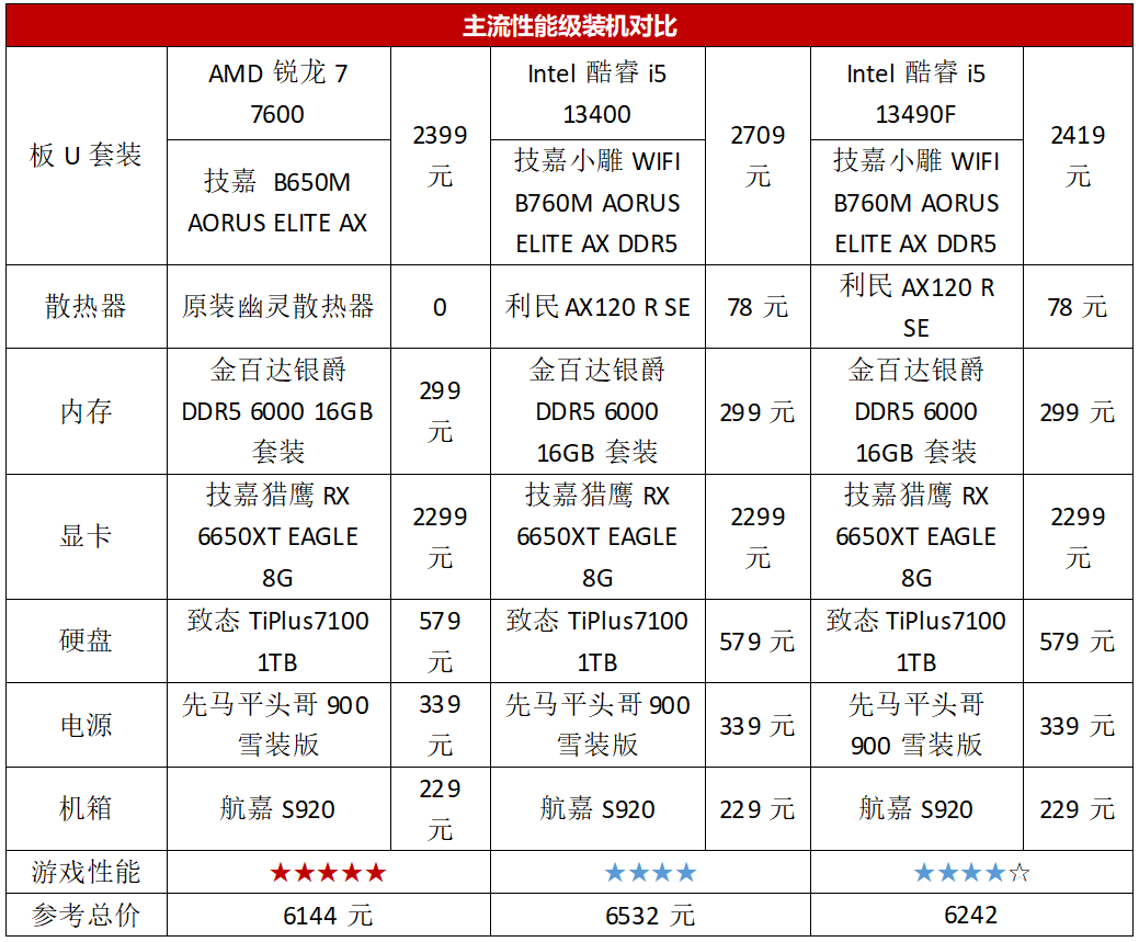 可能会有用户担心锐龙5 7600主机打造成本高,其实并不是这样。现在电商平台上有一些板U套装已经比较实惠了,比如这款AMD锐龙7 7600+技嘉 B650M AORUS ELITE AX的套装价也不过2399元,是要低于两款酷睿i5的套装。而且得益于锐龙5 7600功耗更低的优势,使用自带的原装幽灵散热器即可满足散热的需求,不用额外购买散热器增加装机预算。仅凭这一点,在其他硬件相同的前提下,就让锐龙5 7600的装机成本低于两款酷睿i5。