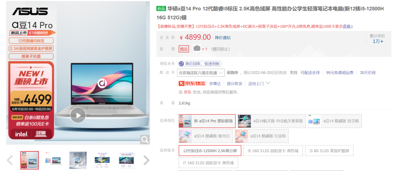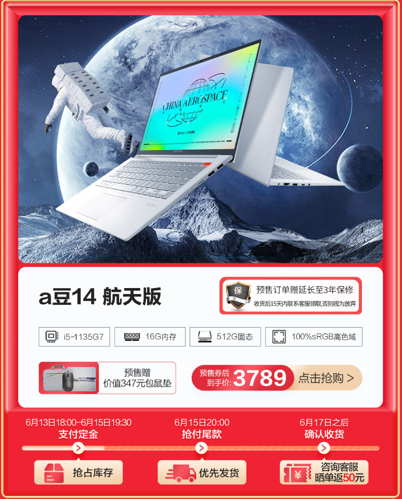 作为a豆与中国航天联名定制的一款产品,个性十足的华硕a豆14 航天版也在618期间迎来了限时优惠活动,预售券后价3739元,下单即赠价值347元的华硕包鼠垫非常超值。