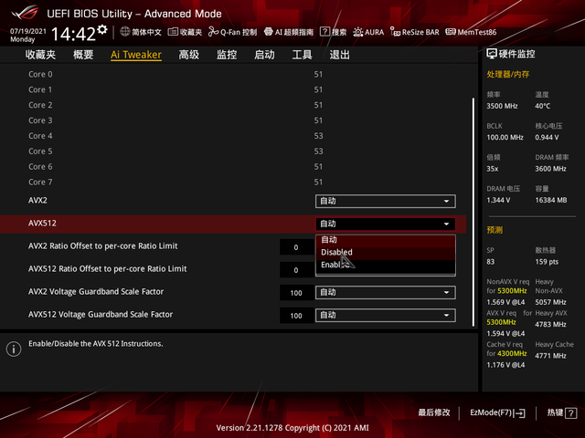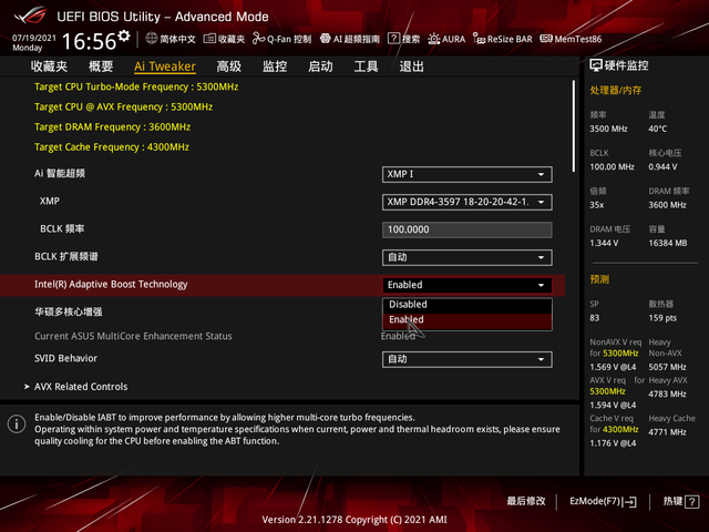 Z590在BIOS中提供了ABT开关的选项,就在AI Tweaker的菜单下,玩家可以设定打开或者关闭。由于我们的主题是让电脑发挥正常性能,那么针对Z590+i9 11900K这样的顶级组合,自然也就建议大家开启此项选项,让其“满血”发挥。
