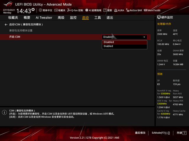 在主板的“启动”主菜单中,有一个CSM(兼容支持模块)设定,这项设定用于完全兼容新老硬件的现实、启动设备——主要是兼容MBR引导系统,适用于不想重装系统的MBR系统老硬盘。不过绝大多数情况下都建议大家关闭(关闭也是默认设定),因为对于新硬件组成的电脑,直接设置成UEFI模式装系统即可(开启Resize BAR、升级Windows11都需要UEFI模式)。