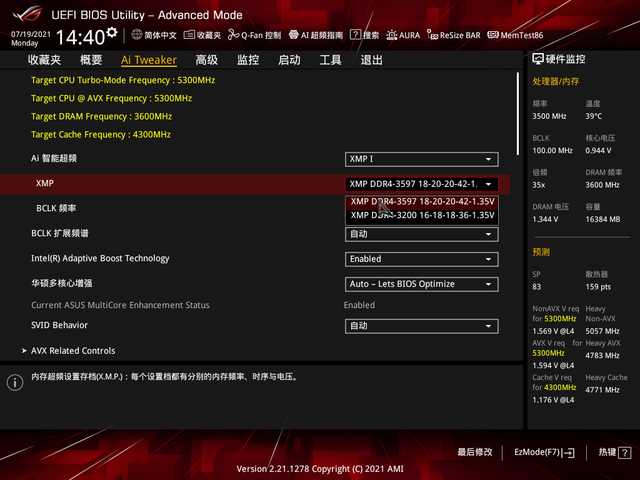 这时候,我们就可以通过开启内存XMP模式来达到标称的数值,将电脑性能提升到应有的水平。当然,高规格的主板还可继续向上超频。其中厂家标称频率是经过测试的可稳定运行的数值,XMP包含了一套标称频率的电压、时序等参数预设,开启XMP可看做是内存“一键超频”。比如在下图的设定中(具体菜单是AI Tweaker→XMP),大家可以看到,该内存XMP有3200MHz和3600MHz(3597)两个预设选项,3600MHz就是我们这两条内存标称的频率,我们只需要将设定选为此项即可。
