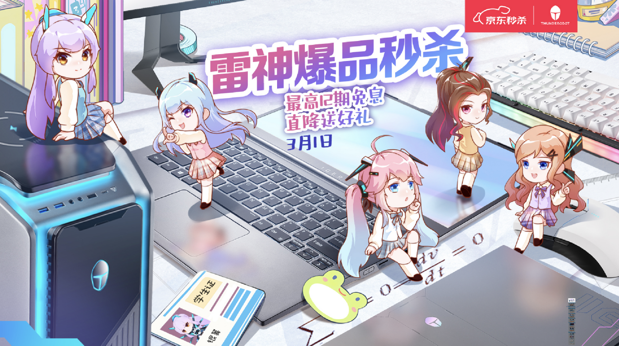 3月1日快乐激增,雷神京东秒杀日开启。来【雷神京东自营官方旗舰店】惊喜开挂,轻轻松松秒到爆品;享受最高12期免息、直降送好礼、晒单送背包的超级福利。另外恰逢开学季,学生凭学生证购机登记领取雷神二次元开花盲盒一份,凭开花和机器合影照片有机会再可兑换雷神小雷宇航员手办一个!快打开手机/电脑,尽情秒起来!