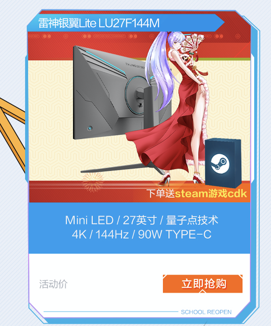 电竞热血机甲外观,搭配新生蓝指示灯光,雷神银翼lite电竞显示器引爆精彩视界。采用创新性的MINI LED背光技术,直下式分区背光;拥有576个分区,2304颗灯珠,真正精确控光,从而大幅度提高对比度。27英寸、4K高清分辨率,细节清晰呈现,超大战场视野提供更好的沉浸感。144Hz持续高速刷新,动态展示更顺滑的画面过渡,降低抖动干扰,让敌人无处遁形;响应时间达到1Ms,分秒必争,大幅减少拖影与画面撕裂;99%Adobe RGB/95%DCI-P3高色域显色,专业显示效果,出厂校准达到99%sRGB覆盖,色彩精准不失真,诠释游戏也可保全色彩 ,在屏幕中还原栩栩如生的色彩效果。搭载两个HDMI2.1超高质量传输接口,支持主机开启高分辨或高刷新率;90W全功能Type-C接口,笔记本一线直连全搞定,带来强大的游戏体验。3月1日秒杀日购显示器即送steam游戏cdk。
