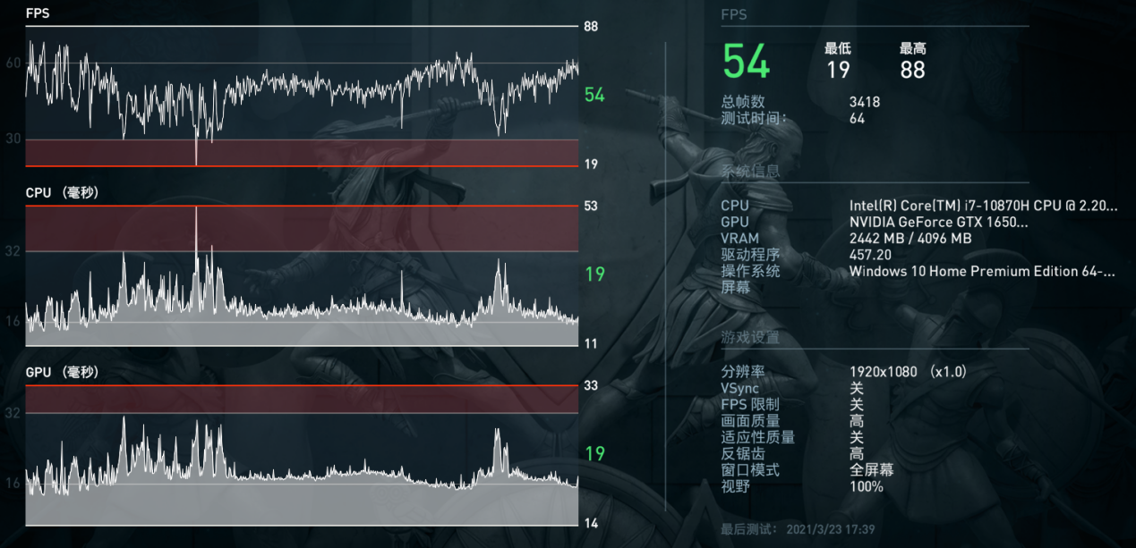 ▲《刺客信条:奥德赛》,将星X15在FHD下高画质平均帧速54fps,高于GTX 1650机型的47fps。