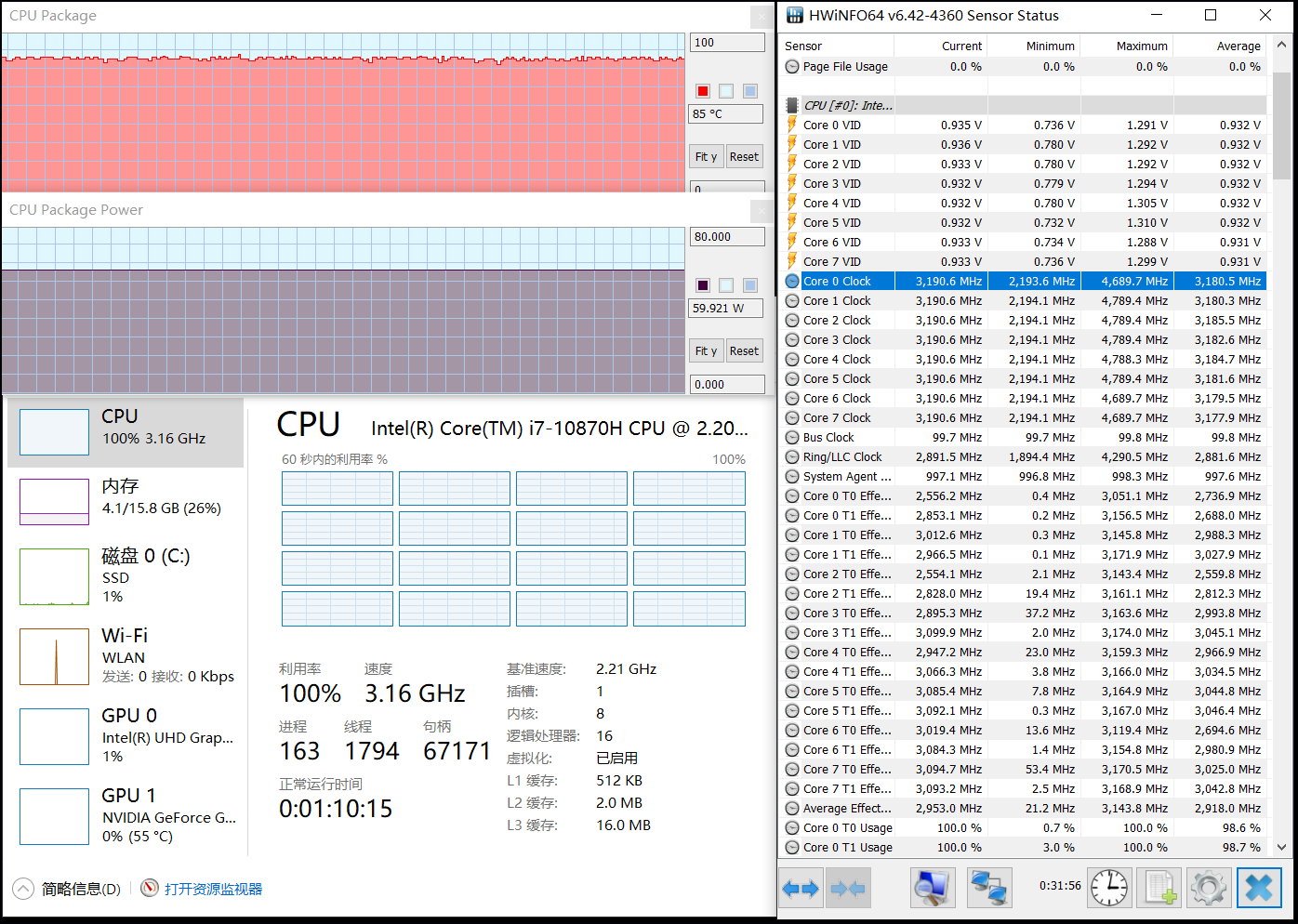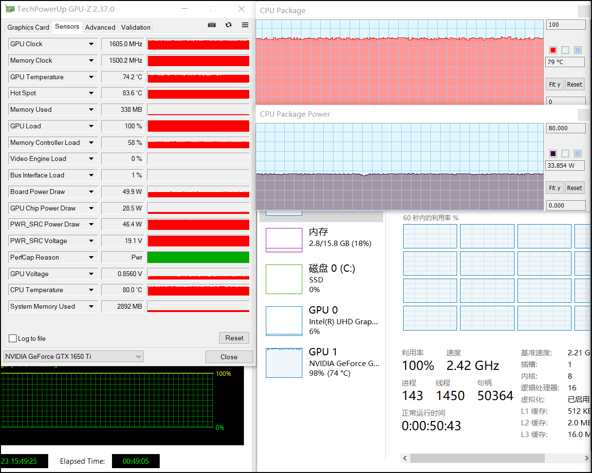 室温24℃左右,对该机进行双核满载考机(如上所说采用娱乐模式),持续约50分钟后,处理器i7 10870H的封装功耗约为33W,频率则在2.4GHz,温度79℃;独显GTX 1650Ti的功耗为50W,频率达到了1600MHz,温度74℃。