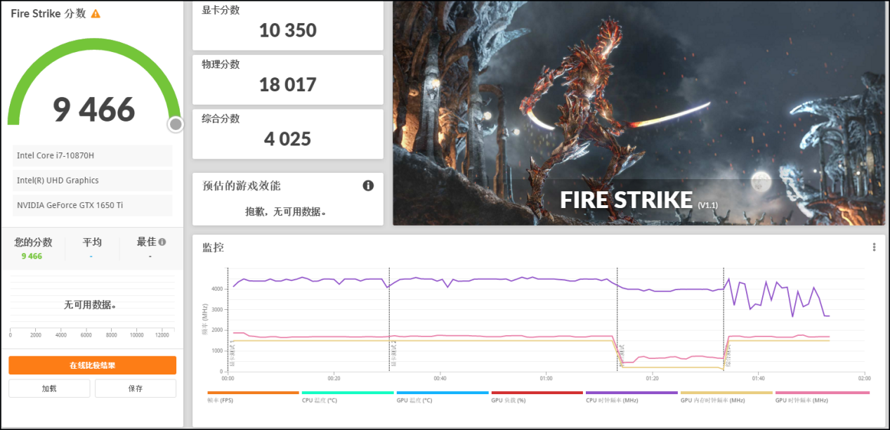 ▲DX 11的Fire Strike场景中,将星X15的总分为9466,显卡分数为10350。作为参考,GTX 1650显卡分数为9270。