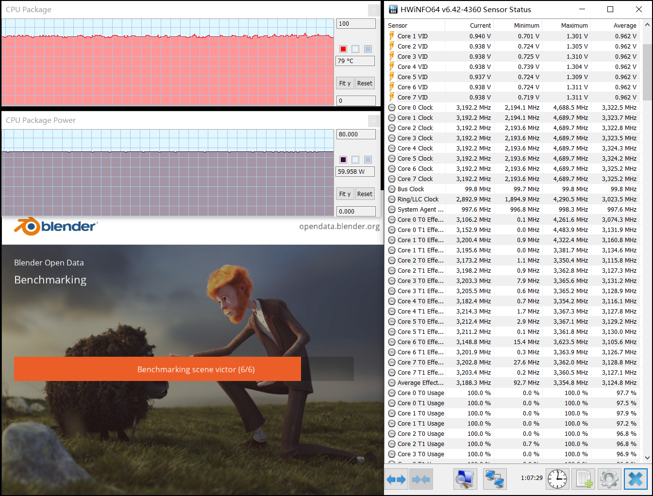 ▲重度负载测试Blender Benchmark六个场景连续渲染,软件版本为最新的2.92,由于场景数量较多,所以该测试即便是对于8核处理器来说也需要五六十分钟,足以考察处理器满载时的运行情况,也可模拟出该机长时间满载时的状态。从测试中可以看到,进行到最后一个场景时,将星X15的i7 10870H处理器的封装功耗为60W,全核频率约为3.2GHz,温度则在80℃附近。