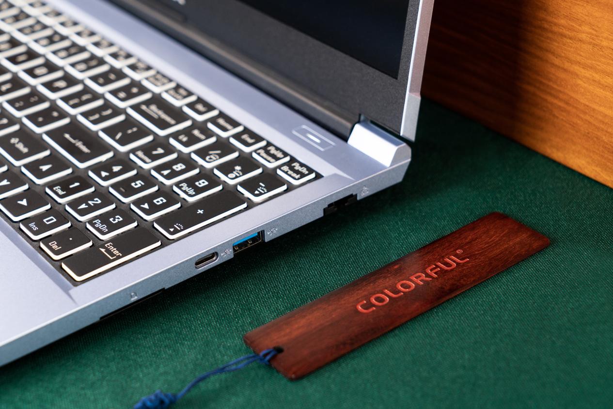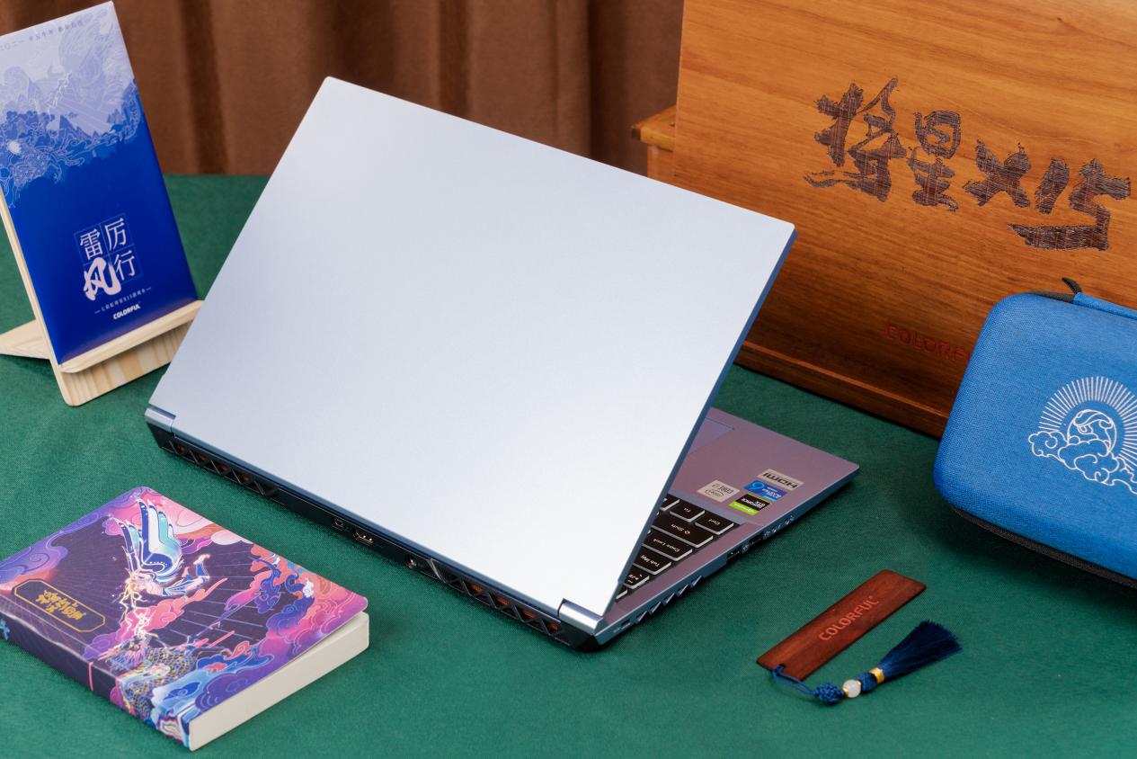屏幕面为时下流行的窄边框设计,屏幕上方保留了摄像头,下方印有COLORFUL的字母LOGO。C面的右侧碗托雕刻着有雷震子展翅飞翔的形象——雕刻形象的肌理代表着年轻张力,双翼振翅飞翔预示着雷厉风行,而雷震子所象征的自由果敢、不受束缚则和当下新时代年轻人的追求一致。