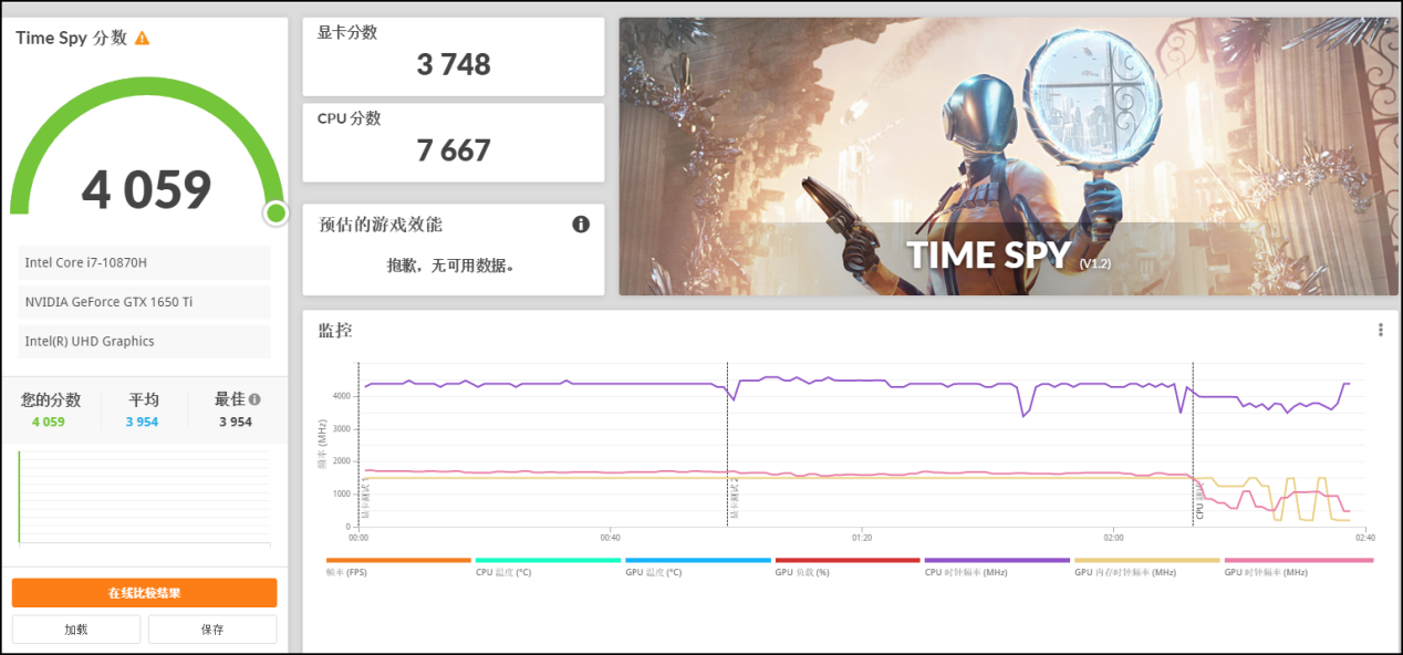 ▲3DMark显卡基准测试,将星X15在DX12 Time Spy场景总分为4059,显卡分数为3748,满血50W GTX 1650Ti水准,稍微高于GTX 1650的3423,领先幅度约为10%。