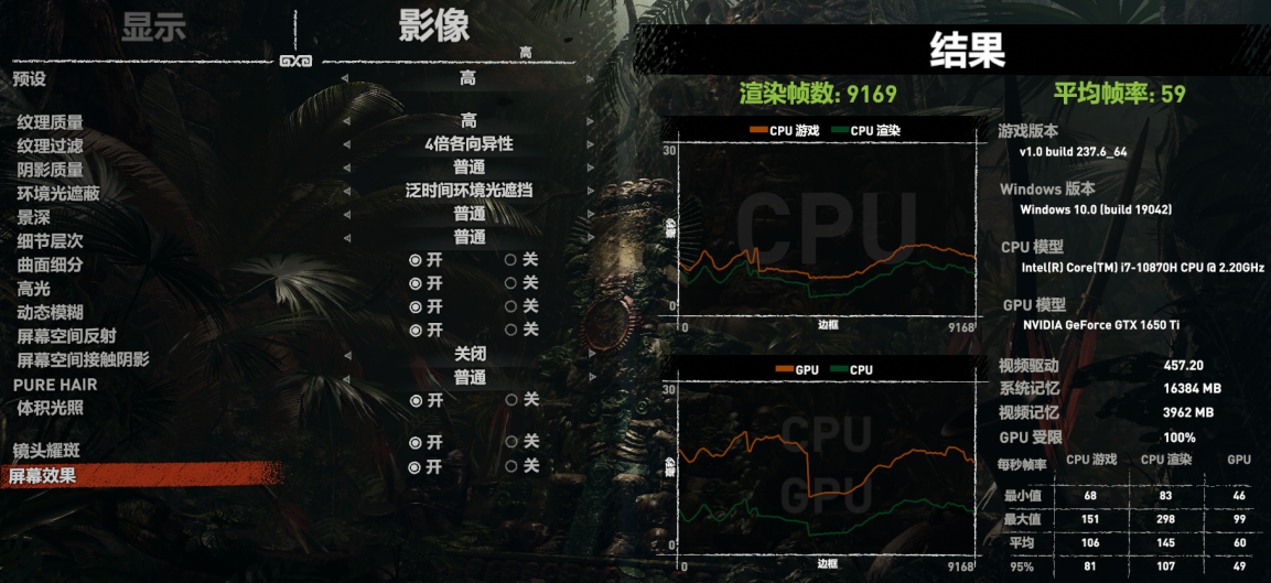 ▲《古墓丽影:暗影》FHD高画质,将星X15的平均帧速59fps,GTX 1650的平均帧速为55fps。