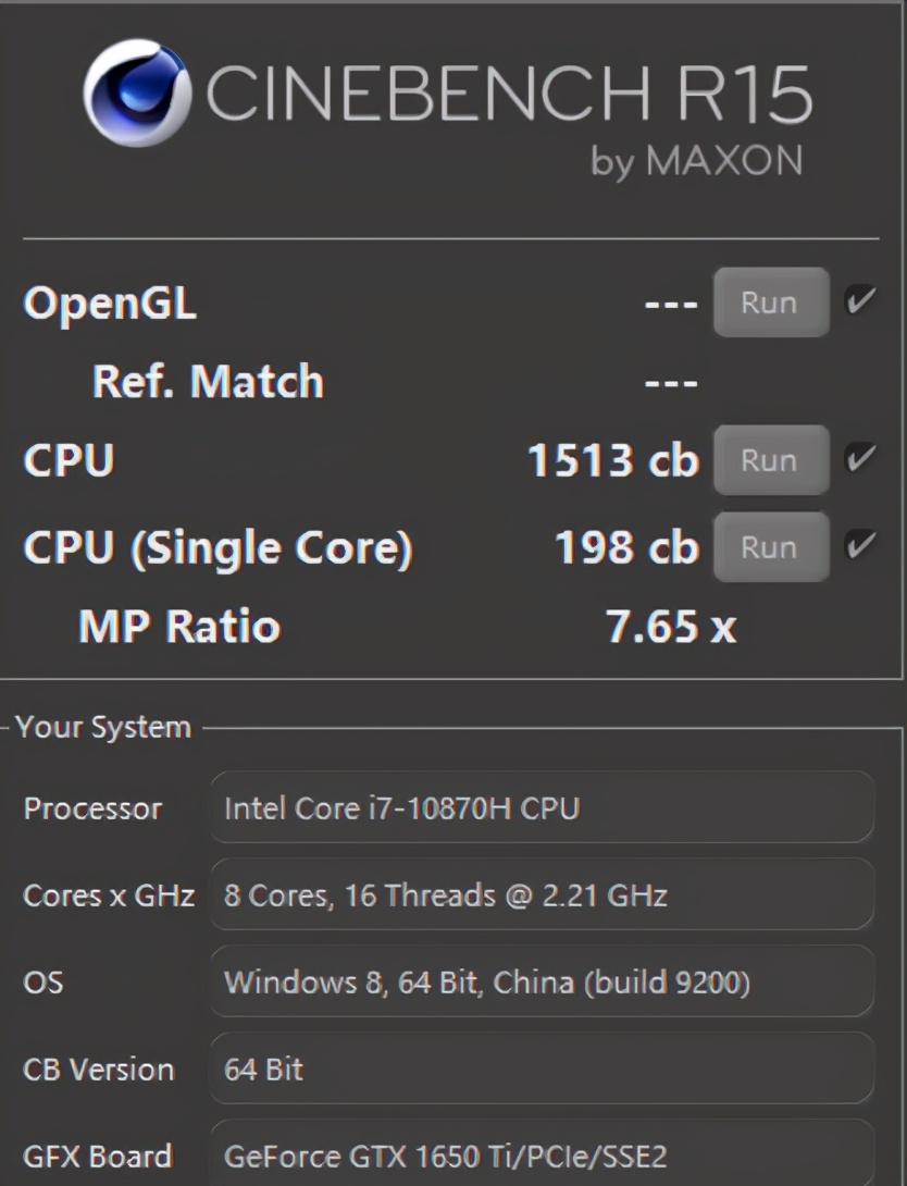 ▲常见的Cinebench R15测试,对于8核16线程的i7 10870H来说,此项测试是"小菜一碟",该机的多核得分为1513cb,单核得分为198cb。这个多核分数处于62W的i7 10750H(1244cb)和70W的i7 10870H(1637cb)之间。