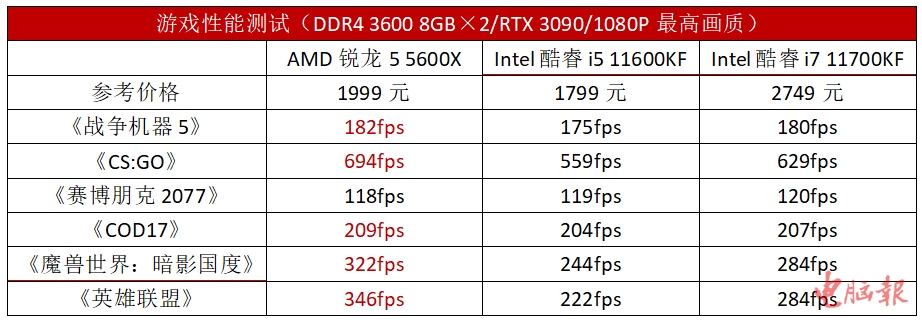 从具体的游戏表现来看,因为单核性能上的优势,锐龙5 5600X在网络游戏中的表现堪称惊艳!在《魔兽世界:暗影国度》、《英雄联盟》和《CS:GO》这样的网络游戏中,最高领先酷睿i5 11600KF的幅度达到了50%以上,面对酷睿i7 11700KF依然保持了10%~22%的领先。在单机大作的测试当中,锐龙5 5600X除了在《赛博朋克2077》当中以微弱的劣势小负对手之外,其他游戏当中同样不处下风。可以说锐龙5 5600X不仅仅是2000元内性能最强的游戏处理器,就算是与定位更高的2000元以上的产品相比,游戏性能也是仅次于锐龙7 5800X的存在。