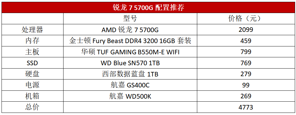 当然在拥有超强游戏性能的同时,锐龙7 5700G在性价比方面的表现也是相当出色。锐龙7 5700G盒装价格也才2099元,比酷睿i7 11700K便宜了足足400元。更不要说目前卖价为2299元的酷睿i5 12600K只能搭配Z690主板,这意味着光是处理器和主板至少都要花将近4000元了,而笔者推荐的这套锐龙7 5700G全能配置也不过4800元不到。锐龙7 5700G是真的香。