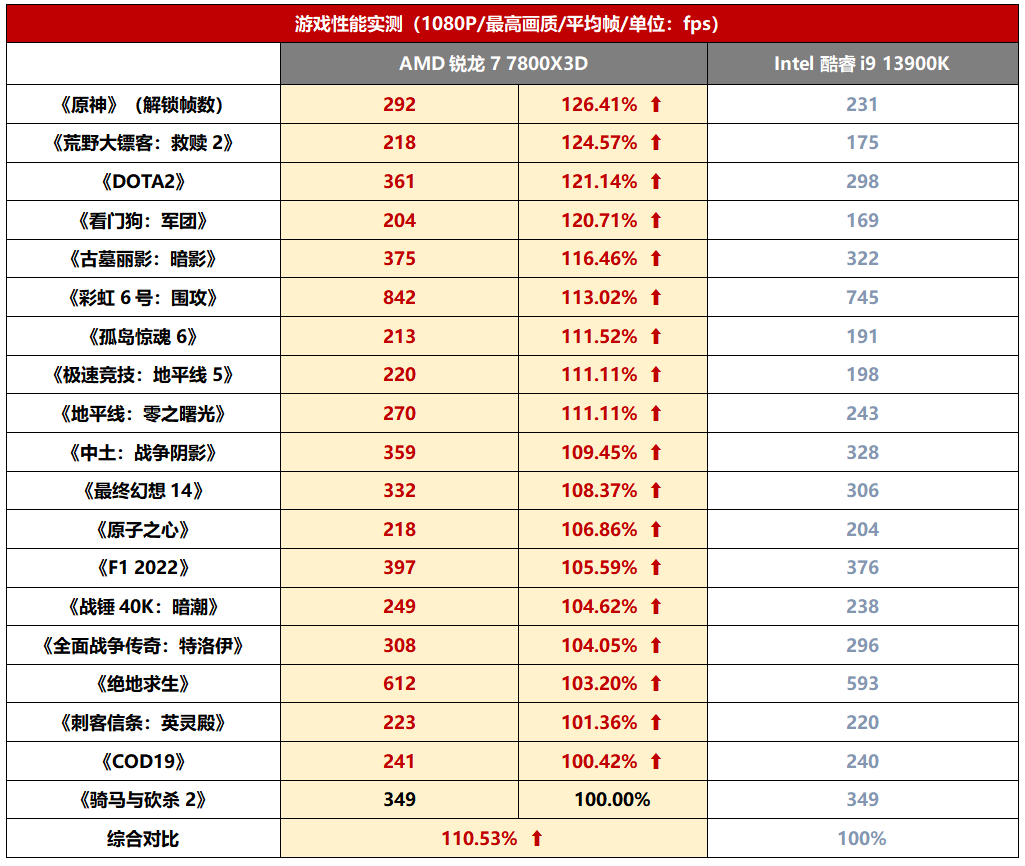 综合所有测试游戏的情况来看,锐龙7 7800X3D平均领先酷睿i9 13900K大约10.53%,很明显是高了一个级别。目前来看,按照游戏综合性能分级的话,锐龙7000X3D三款成员可以说是稳坐第一梯队,往下才是酷睿i9和其它型号。