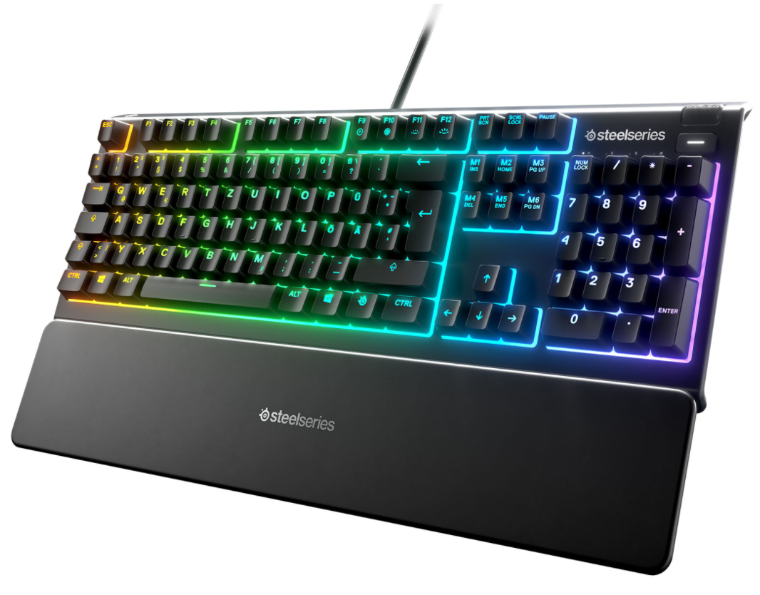 赛睿APEX 3沿用了旗舰Apex Pro的时尚简约、设计感强的设计风格,还带有10区调节的RGB灯效,非常炫酷。表面覆盖类肤涂层的键帽呈排列,符合人手打字时的运动轨迹,再加上表面由硅胶材质的磁吸式腕托,带来与同系列中高端产品相同的舒适体验。类似于手机线控的多媒体控制按键和滚轮在Apex 3上得到了保留,按压多媒体按键一次为播放/暂停,按压两次为前进/跳过曲目,按压三次为后退/上一曲目。