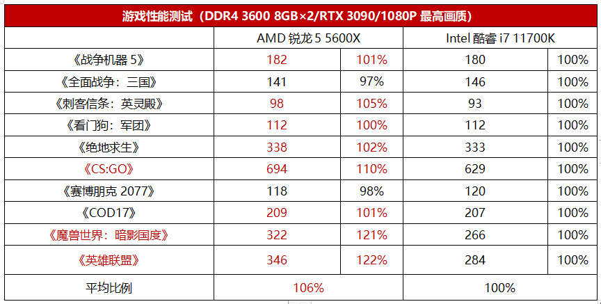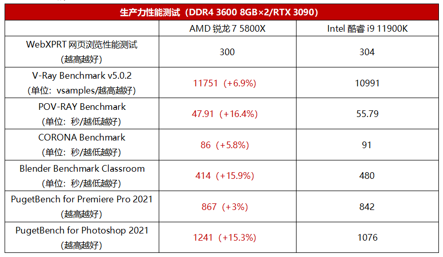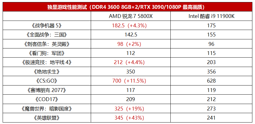 同时即便锐龙7 5800X频率要略低于酷睿i9 11900K,但是凭借着ZEN3架构IPC性能更强的优势,足以抵消其在频率上的劣势,单核性能上并不吃亏。在当下的热门游戏当中,两款处理器的表现只能算是旗鼓相当。所以综合来看,锐龙7 5800X的综合性能表现是强于酷睿i9 11900K的。