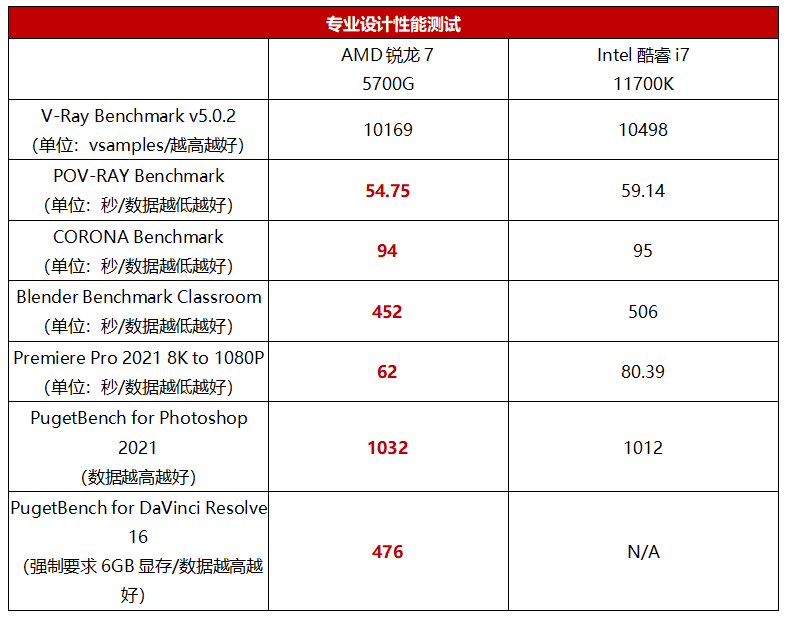 就实际性能表现而言,Radeon Vega 8的游戏性能依然是完胜酷睿i7 11700K当中的UHD 750。选择这种8核CPU,相信大家更看重其专业表现。锐龙7 5700G的ZEN3架构确实拥有更强的多线程与强悍的单线程性能,另一方面锐龙5000G把手动设置显存容量(占用系统内存)的上限设定为了16GB,相比上代零售版锐龙APU的2GB上限高了7倍!拥有超大显存的Radeon Vega核显也带来了更强的生产力加成——最强APU的真正威力终于发挥了出来。在大多数3D建模渲染输出软件中的表现都是由于酷睿i7 11700K。而且在视频剪辑部分,锐龙7 5700G的表现也是完胜对手。
