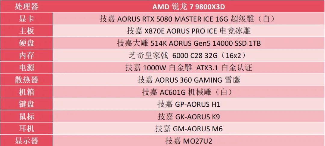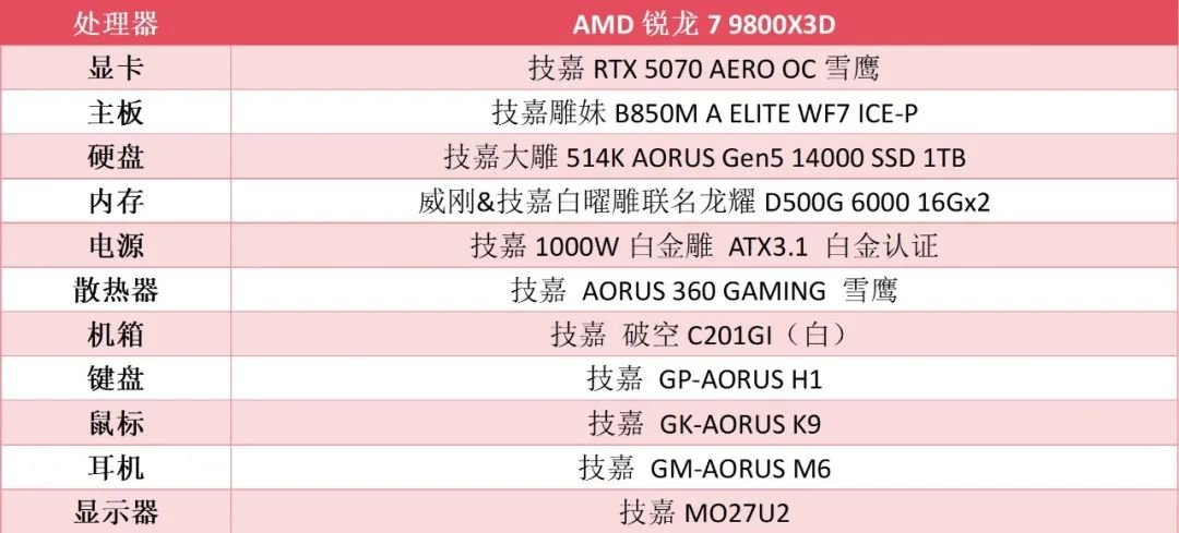 这套配置CPU依然选择了当前最强的锐龙7 9800X3D,显卡则是技嘉AORUS RTX 5070。作为RTX 50系的第四款产品,RTX 5070本身实力不弱还有DLSS 4的加成,可以轻松应对4K游戏,再加上相对比较实惠的价格,无疑是更具性价比的选择。