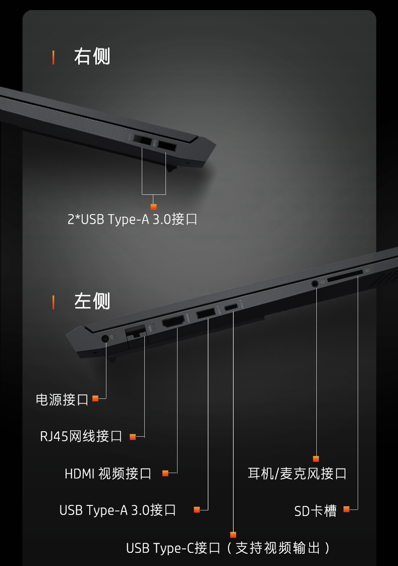 面对游戏、办公应用中各种外接设备的应用需求,惠普VICTUS光影精灵8 锐龙版提供了丰富的接口设计,机身右侧设有两个USB Type-A 3.0接口,左侧设有RJ45网线接口、HDMI视频接口、USB Type-A 3.0接口、USB Type-C接口、耳机/麦克风接口以及SD卡槽在内丰富的接口配置,几乎涵盖了市面上主流的设备的使用需求了。