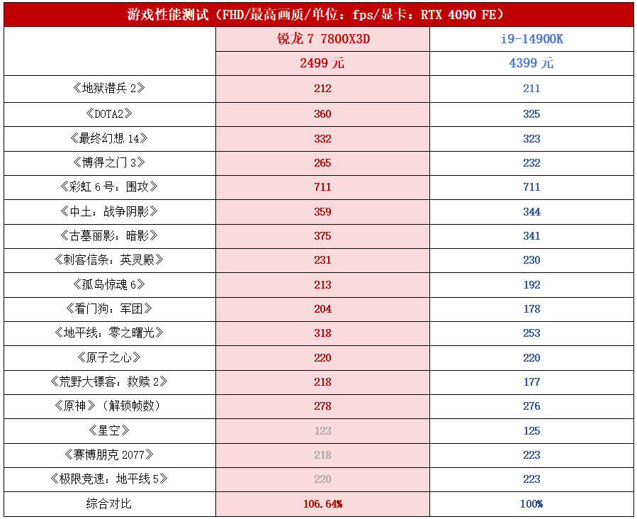 从实际测试成绩来看,大缓存显然比高频率对游戏性能收益更大。锐龙7 7800X3D在《DOTA2》《博德之门3》《孤岛惊魂6》《地平线:零之曙光》《荒野大镖客:救赎2》的优势都在10%以上,在《地平线:零之曙光》《荒野大镖客:救赎2》中的优势甚至超过了20%。综合17款游戏的成绩来看,锐龙7 7800X3D相对酷睿i9 14900K的优势达到了6.64%,优势非常明显。更为重要的是,锐龙7 7800X3D在先进5nm制程的加持下,功耗、发热的控制更出色,使用体验更好、装机成本也更低。