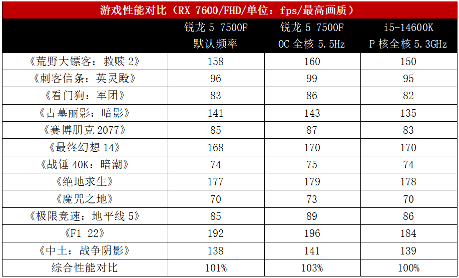 即便是面对酷睿i5最高端的i5-14600K,锐龙5 7500F的表现也丝毫不落下风。综合来说,12款游戏中,锐龙5 7500F的平均领先幅度为1%。如果是全核5.5GHz的状态下,此时所有的游戏成绩锐龙5 7500F均实现了领先,性能差距进一步拉大。