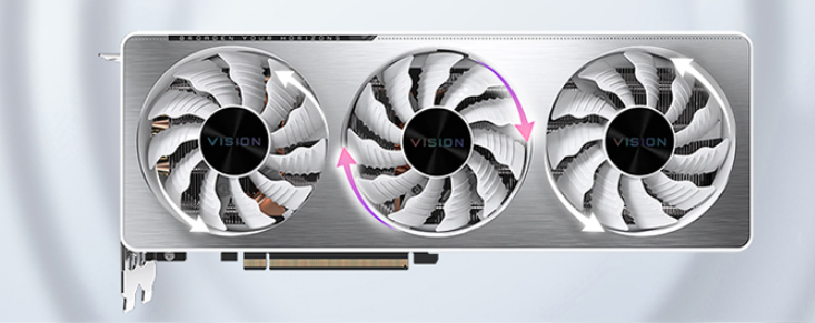 雪鹰GeForce RTX 3070 VISION OC 8G显卡专为设计师打造,它采用银色与白色的搭配,散热器走的是极简科技风,非常符合设计师的审美口味。散热方面,技嘉雪鹰GeForce RTX 3070 VISION OC 8G搭载了风之力3风扇散热系统,风扇采用刀刃式扇叶设计,搭载正逆转功能,3个80mm风扇都支持智能启停,5根高效热管与GPU直触,并在背板上设计了进气格栅,这些设计都有助于大幅提高散热能力。此外,散热器的风扇还配备了纳米石墨烯润滑油,可以大幅延长油封轴承风扇的寿命,达到滚珠轴承风扇的水平。