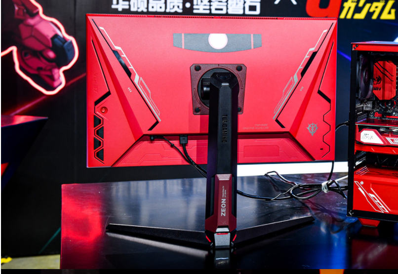 联名款硬件在其他硬件上比较常见,但是在显示器上并不多,华硕TUF GAMING VG27AQL1A渣古就是一个不错的选择。产品选取渣古经典的红、暗红和黑色配色,通过标志性独眼贴以及渣古LOGO等,打造出了信仰满满的渣古深度定制外观,很符合高达迷的胃口。