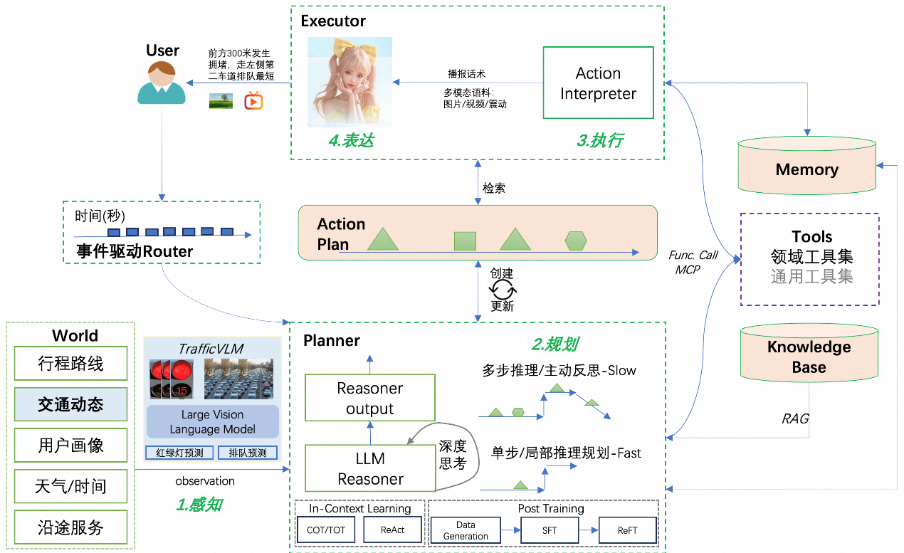 据技术负责人介绍,其核心架构采用Planner-Executor模式,通过感知、规划、执行、表达四大模块构建智能闭环,集成多项高德核心技术:在感知层,TrafficVLM模型可捕捉多尺度的交通时空变化, 而交互层的AmapVoice情感语音技术,则将温度赋予导航产品。