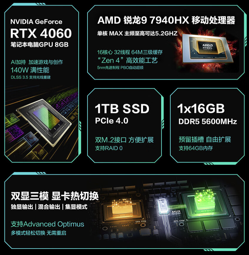 天选5 Pro锐龙版同样深受二次元玩家喜爱。其搭载AMD锐龙9 7940HX处理器,采用16核心32线程设计,单核MAX主频达5.2GHz,在满功耗GeForce RTX 4060笔记本电脑GPU加持下,轻松畅玩游戏大作,更支持PBO自动超频,进一步优化处理器性能;同样配备16英寸全能电竞屏,2.5K高分辨率165Hz高刷新率,支持100% sRGB色域覆盖,游戏画面更精彩;还有天选炫彩影刃键盘,为玩家游戏提供满满氛围感。