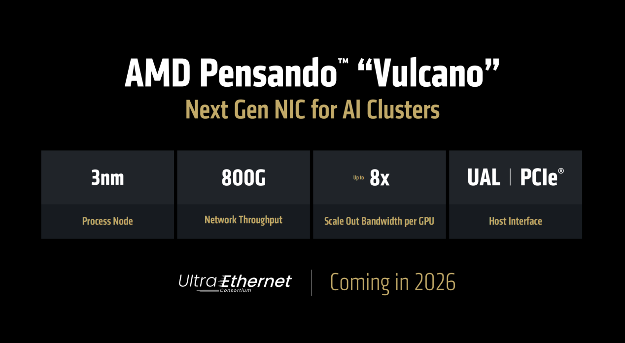 接下来是AI Rack方案里必不可少的“超级网卡”,目前MI350系列的AI Rack方案里搭载的是刚发布的POLLARA 400,数据带宽可达400Gbps,也就是40万兆网卡。而明年推出的Vulcano,制程升级到3nm,将会把数据带宽升级到800Gbps,变成80万兆网卡,让GPU的Scale Out带宽最多升级到原先的8倍,这也是为什么下一代Helios AI Rack整体性能可以提升那么多的重要原因之一。