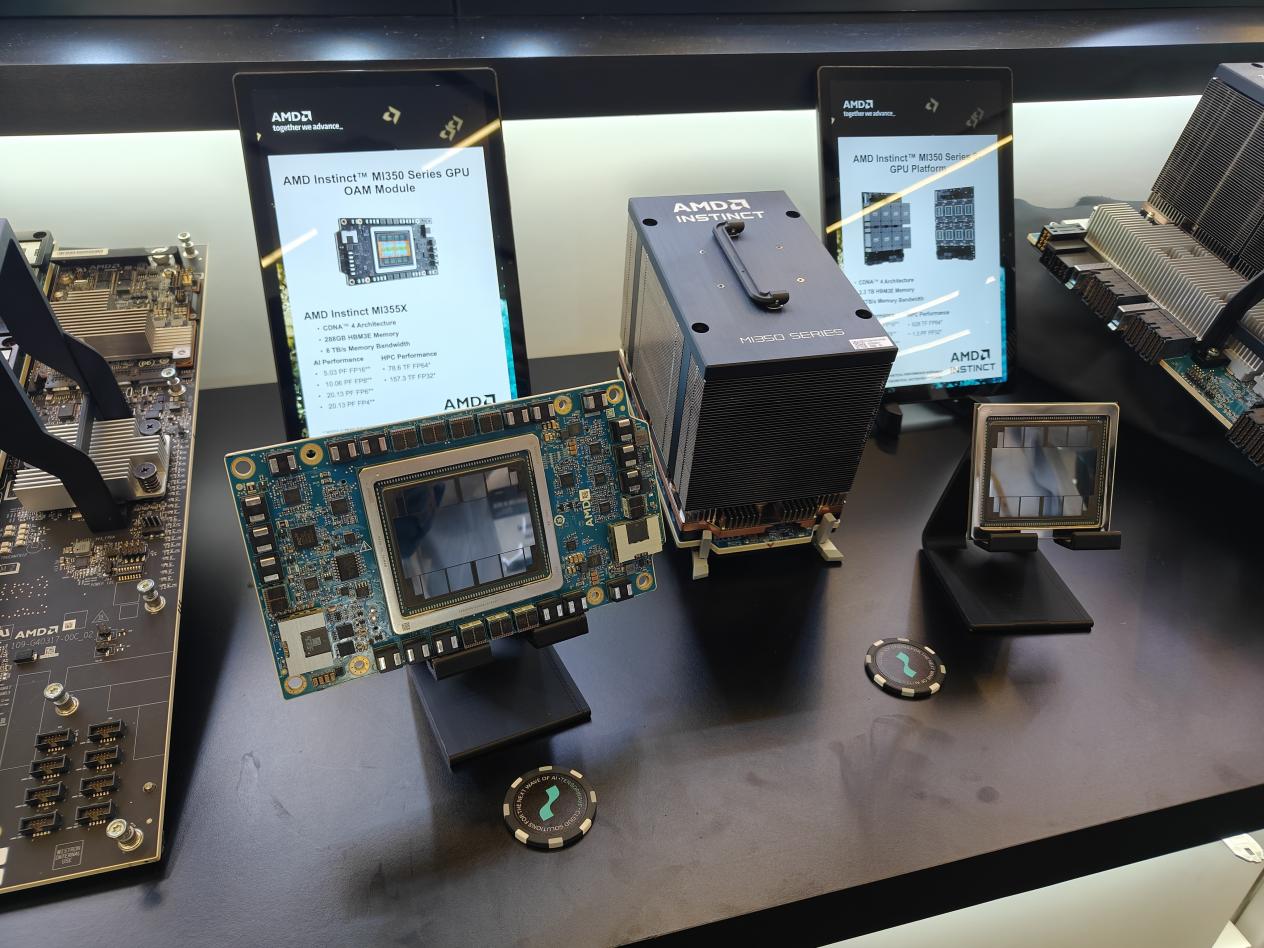 本次大会DEMO区展出最多的就是基于MI350系列GPU的AI 解决方案了。这台Supermicro GPU A+服务器就配备了双EPYC 9005/9004处理器,8个MI350X GPU,支持最多6TB DDR5内存。