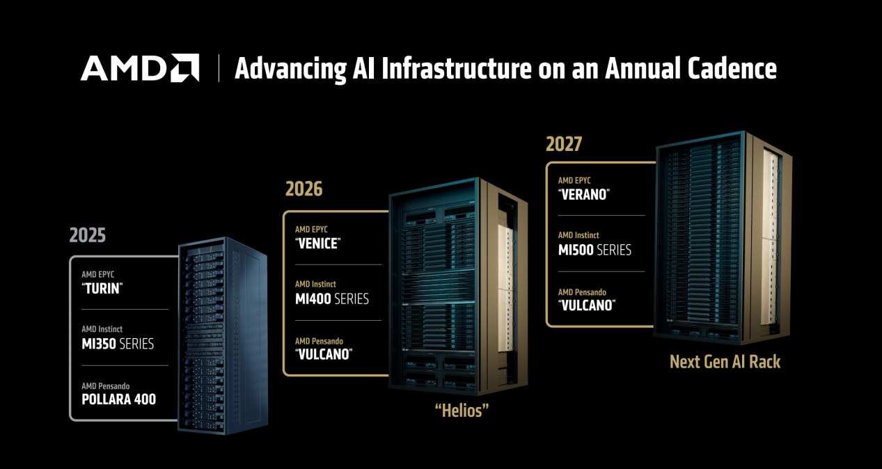 在美国加州圣何塞当地时间6月11日的报道中,我们已经介绍过AMD最新的INSTINCT MI350系列GPU和对应的AI RACK解决方案,同时也简单提到了2026年和2027年即将登场的两套AI RACK方案,分别使用了当年对应的新款EPYC处理器以及MI400和MI500 GPU。而在6月12日,AMD 董事会主席兼首席执行官Lisa Su 博士在ADVANCING AI 2025大会的KEYNOTE演讲中进一步透露了下一代EPYC处理器“Venice”、MI400 GPU和代号“Vulcano”的Pensando超级网卡的细节。