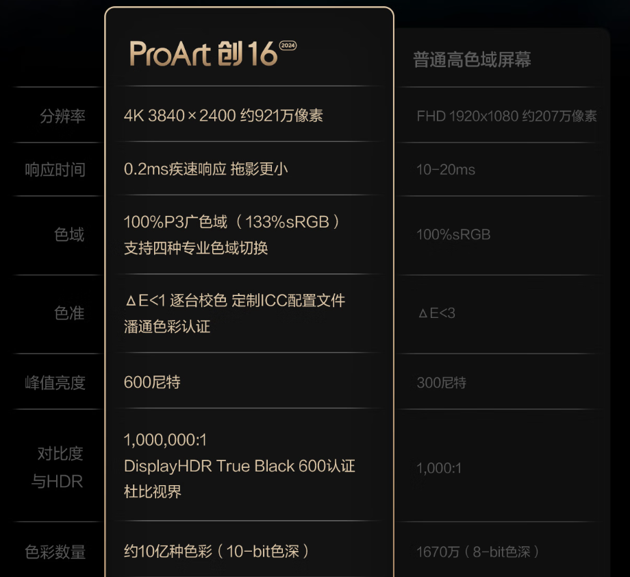 ProArt 创16 2024的4K OLED华硕好屏也是该机的大卖点之一:这是一块16英寸3840×2400分辨率OLED屏,具备100% P3广色域,10bit色深,出厂校色确保ΔE平均值小于1,同时支持4种专业色域切换,峰值亮度600尼特,具备DisplayHDR True Black 600认证,响应时间仅0.2ms,支持10点触控。无论是分辨率、色彩显示还是响应速度,都称得上是专业级的4K创作屏,能够完全满足用户在不同应用场景下对屏幕的显示需求,轻松开启4K HDR创作时代。