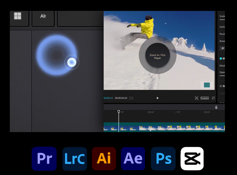 除了坚实的硬件基础以外,ProArt 创16 2024在使用方面还有多项专为创作者优化的功能设计,例如触控板上的华硕虚拟旋钮,它是一个深度适配多款创作应用的特色功能,不仅支持多款Adobe创作应用,例如Ae、Pr、Ps、LrC等,还与国产剪辑应用剪映联合定制,在剪映中适配了多项快捷操作:实现剪辑帧的前进/后退、全局数值调节等优化,还能自定义10项剪辑快捷功能;在LrC中利用华硕虚拟旋钮来调节曝光度/对比度/高光/阴影等;在Pr中可设定时间轴缩放、时间轴调整等。
