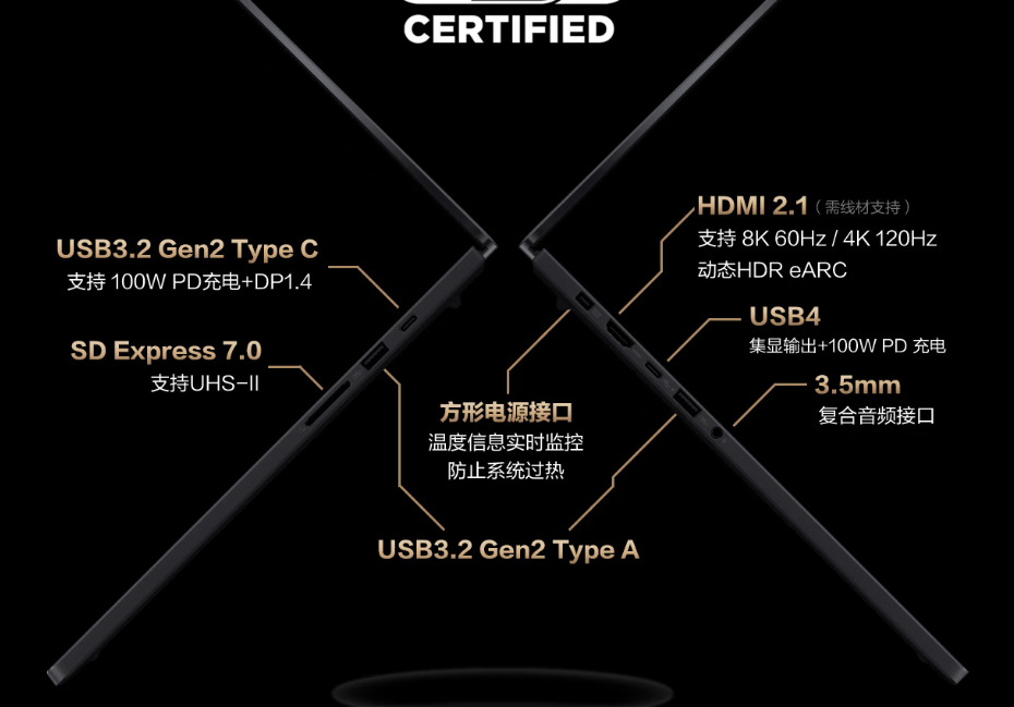 机身左侧是USB 3.2 Type-A口,USB 4,HDMI2.1,3.5mm音频口和方形电源口;右侧是USB 3.2 Type-C,USB 3.2 Type-A口以及SD Express 7.0读卡器。左右各有一个USB-A口,保证了日常外接鼠标、U盘等设备的易用性。两个高速USB-C则意味着ProArt 创16 能快速传输大量文件素材,或者实现极为丰富的设备扩展体验。